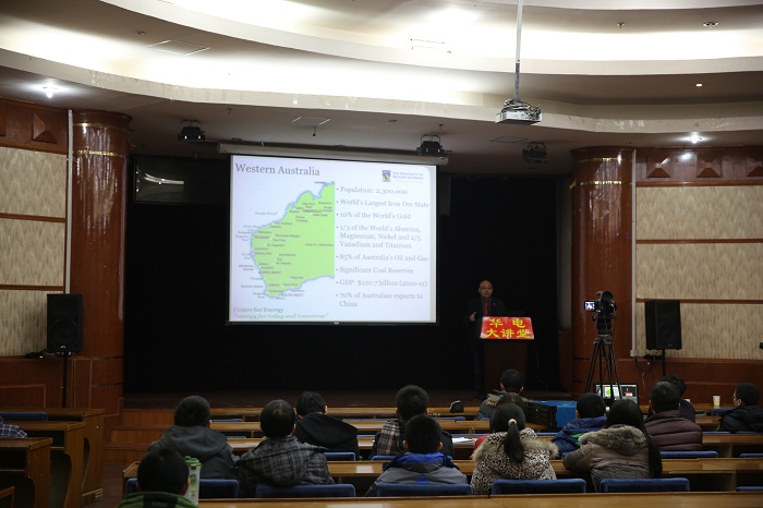 张教授从地图形状等各方面描述了中国与澳大利亚的相似之处。随后,他又从澳洲的历史、人口、人均收入、贫富比例等方面向同学们介绍了澳洲的国情。他着重强调了澳洲西部和澳洲首都—堪培拉的地理、人文环境。张教授向同学们介绍了西澳能源中心,即西澳在能源科学研究、技术开发和工业应用领域世界领先的研究团队和设施。西澳能源中心注重合作,它与中国的合作甚多,其中包括与华北电力大学共同制定了“111”计划,即流化床煤热解、燃烧,褐煤提质,超超零界发电技术。张教授还向听众展示了温家宝、贾庆林等国家领导人到澳洲参观西澳能源中心的照片。接着,他提出了能源领域中很重要的碳循环结构,并以此引出表面催化剂的催化作用。同时,张教授还针对催化剂活性降低的现象作出解释,并由催化剂过渡到甲醇制柴油这个课题。对于这个课题,张教授给大家讲解了各种制造方法。