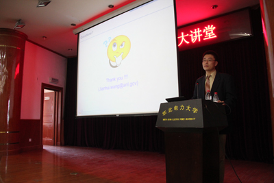 4月24日下午3点,在我校科学会堂华电杰出校友、美国阿贡国家实验室研究员王剑辉博士做了题为“风力预测及大规模电力系统接入”的讲座。